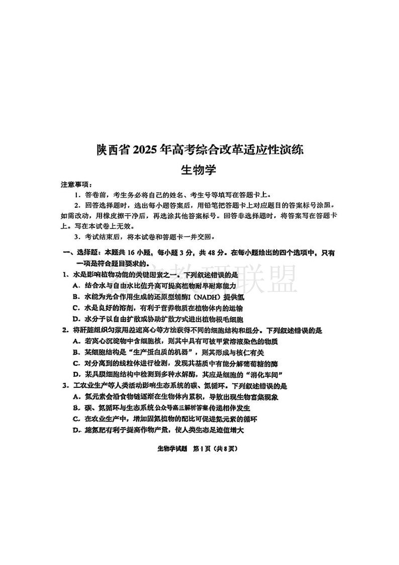 陕西、山西、宁夏、青海四省2025年高考综合改革适应性演练 生物.pdf