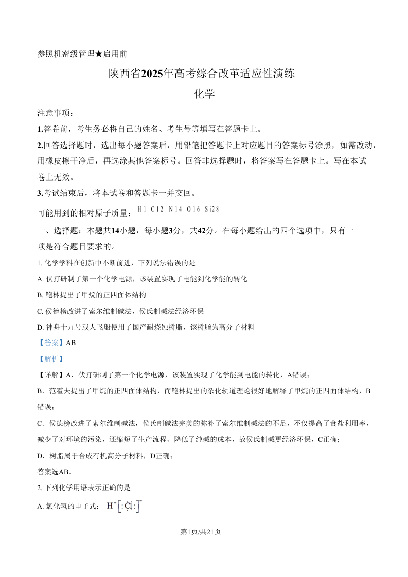 陕西、山西、宁夏、青海四省2025年高考综合改革适应性演练 化学答案.docx