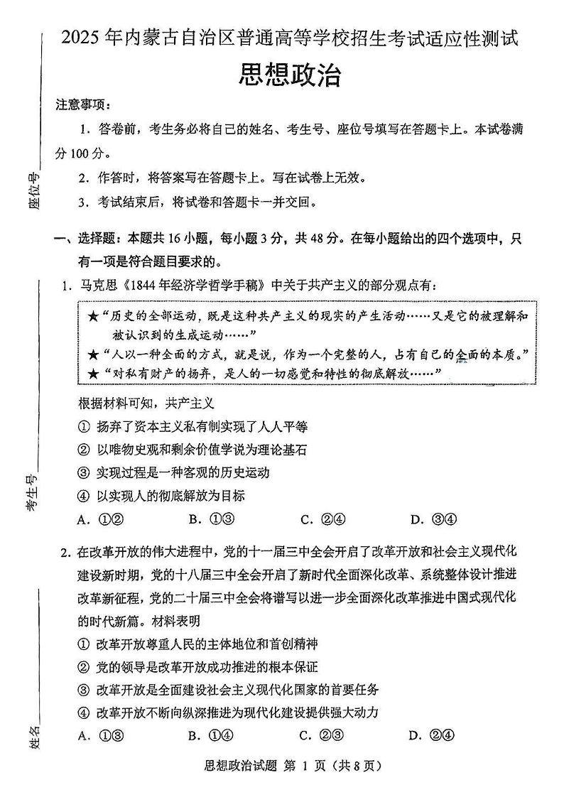 内蒙古2025年高考综合改革适应性演练 政治.pdf