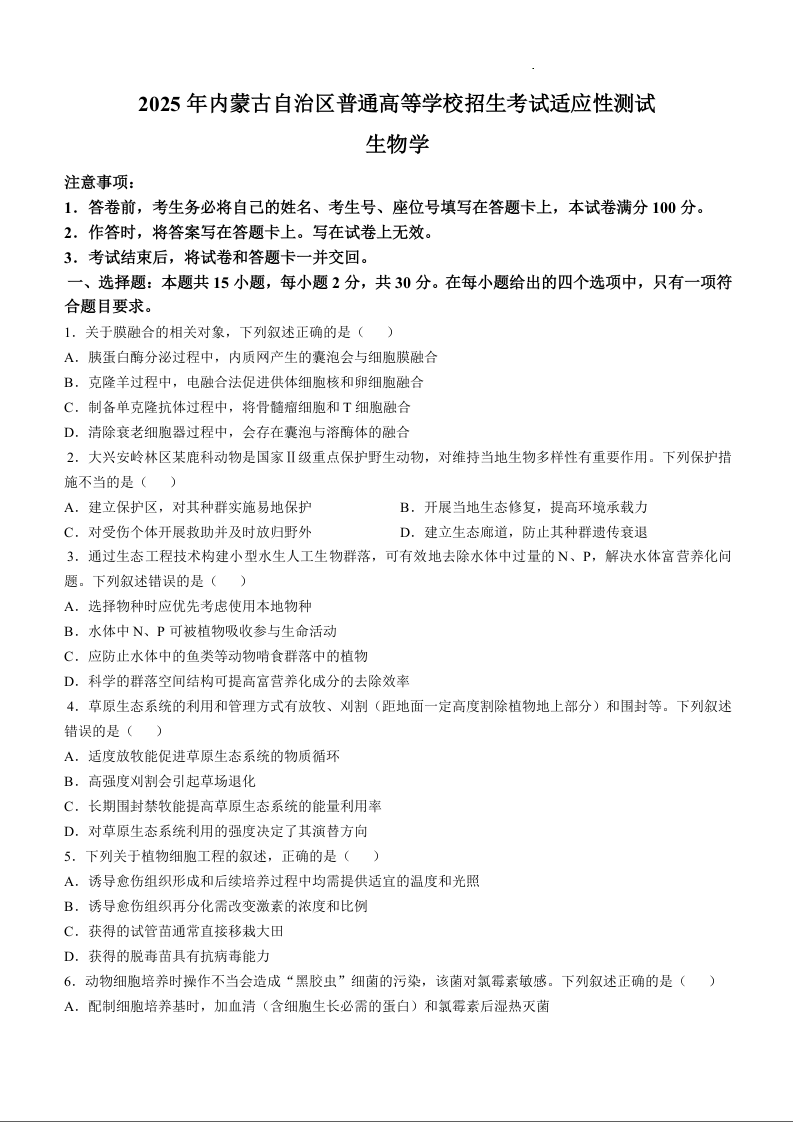 内蒙古2025年高考综合改革适应性演练 生物.docx