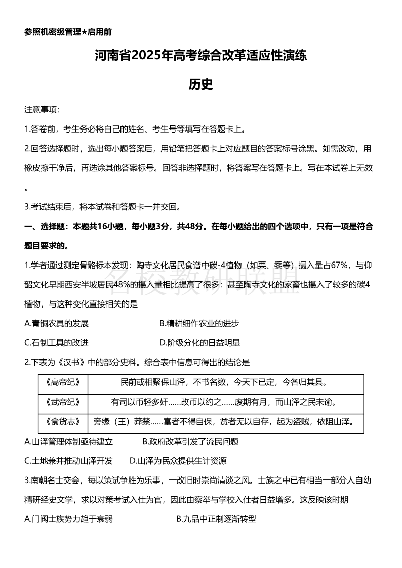 河南省2025年高考综合改革适应性演练 历史答案.pdf