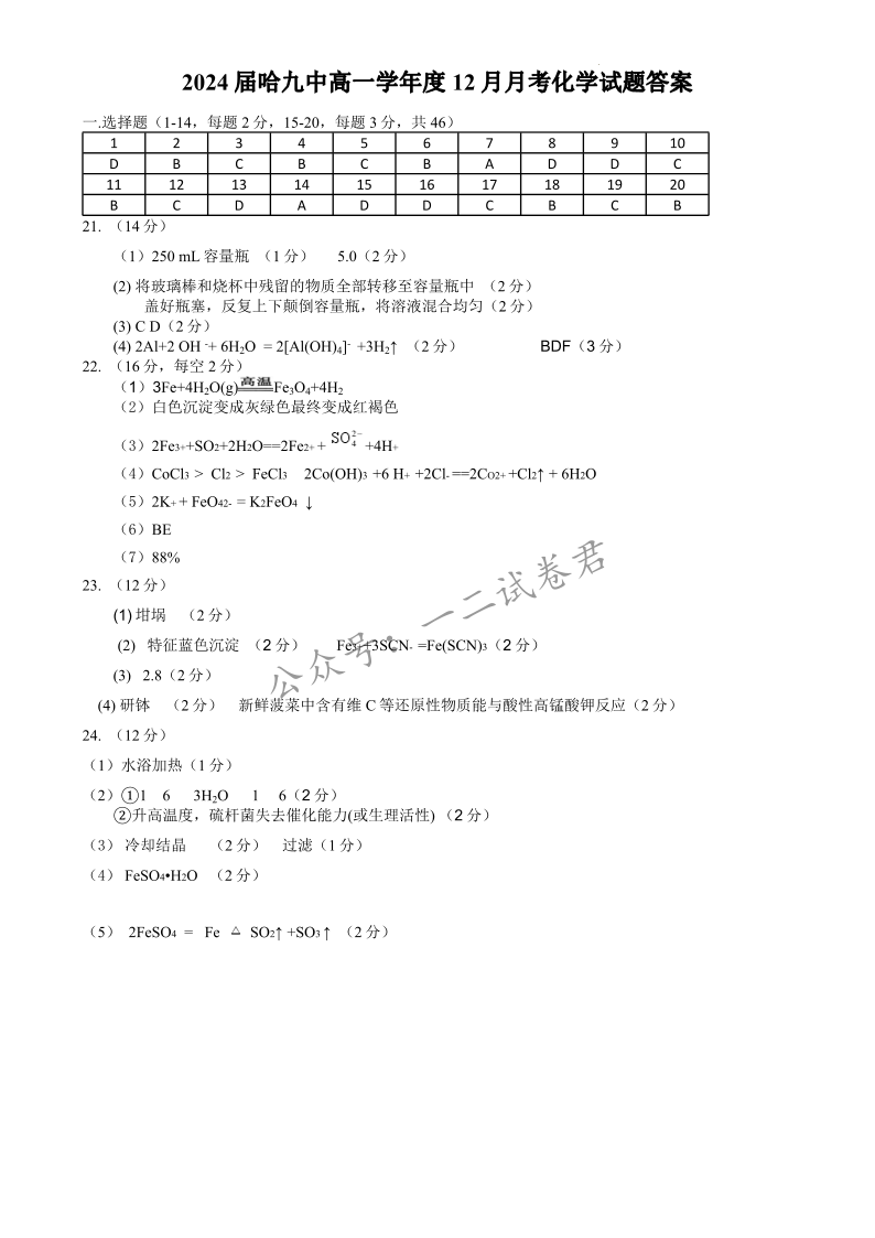 哈九中2024级高一学年12月月考 化学答案.pdf