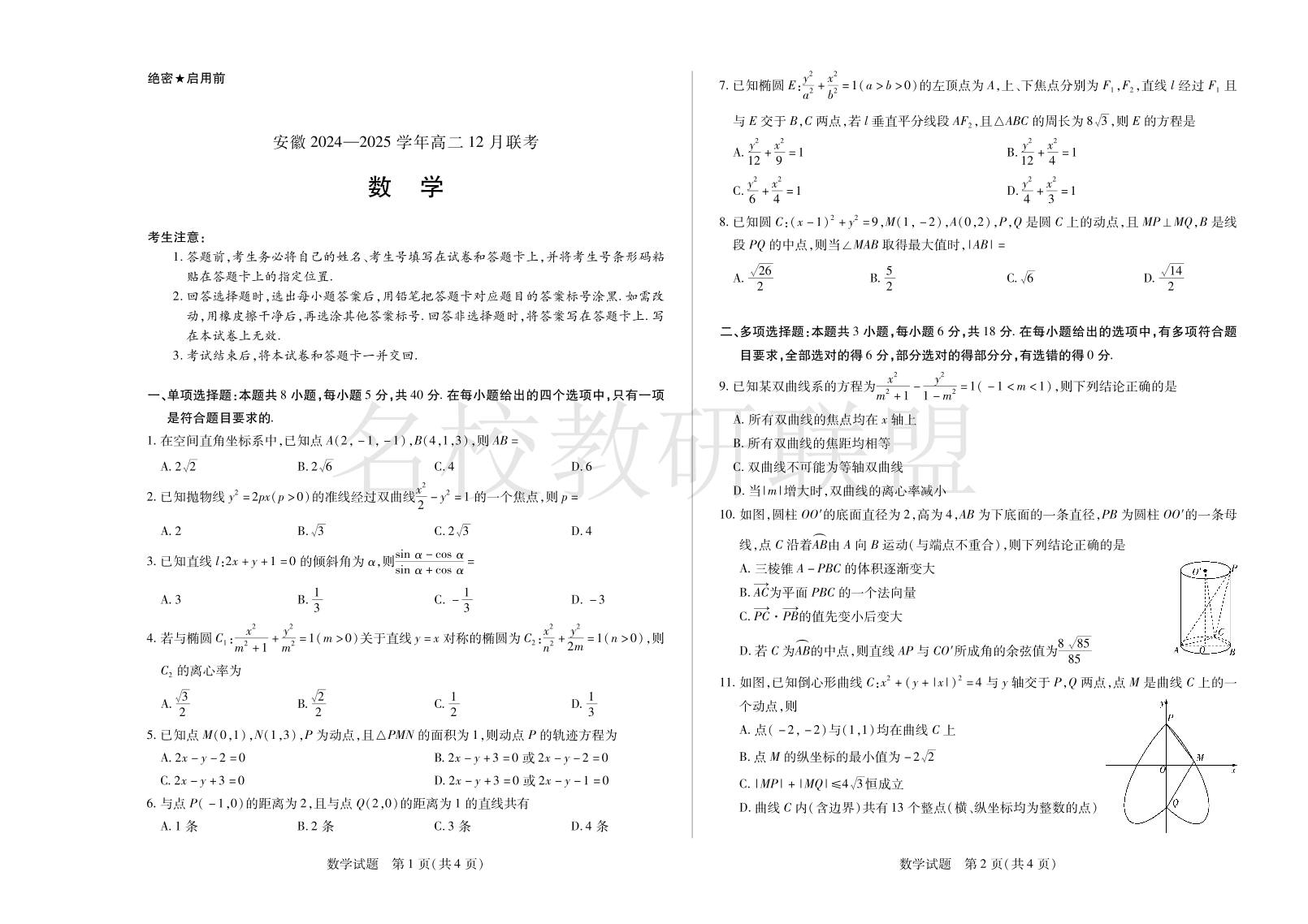 安徽省2024-2025学年高二上学期12月联考 数学.pdf