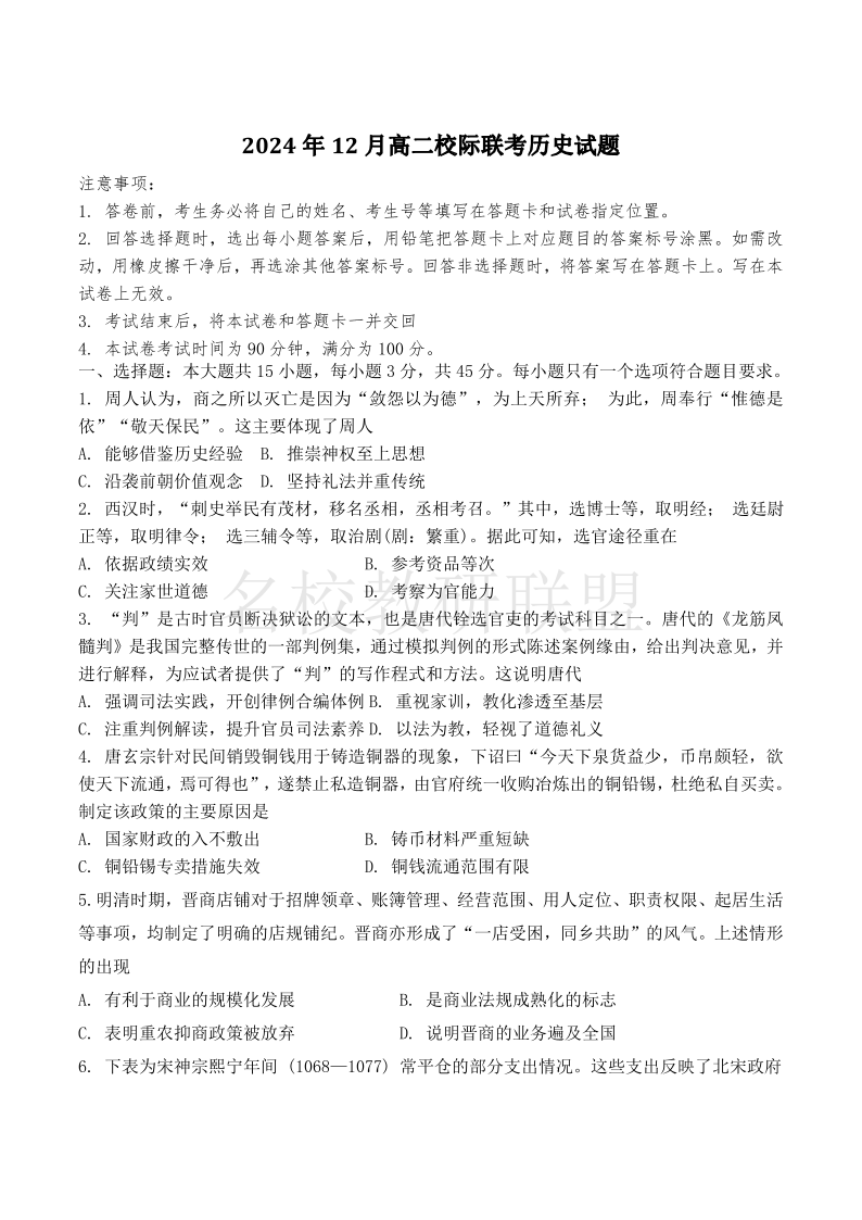山东省济宁市校际联考2024-2025学年高二上学期12月月考 历史.pdf