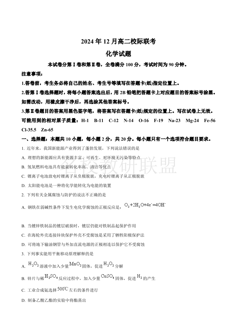 山东省济宁市校际联考2024-2025学年高二上学期12月月考 化学.pdf