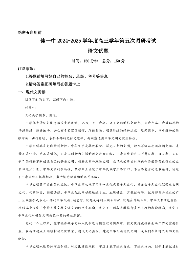 黑龙江省佳木斯市第一中学2025届高三上学期第五次调研考试 语文.docx