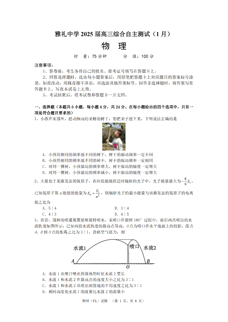 湖南省长沙市雅礼中学2025届高三1月综合自主测试(期末)物理.pdf