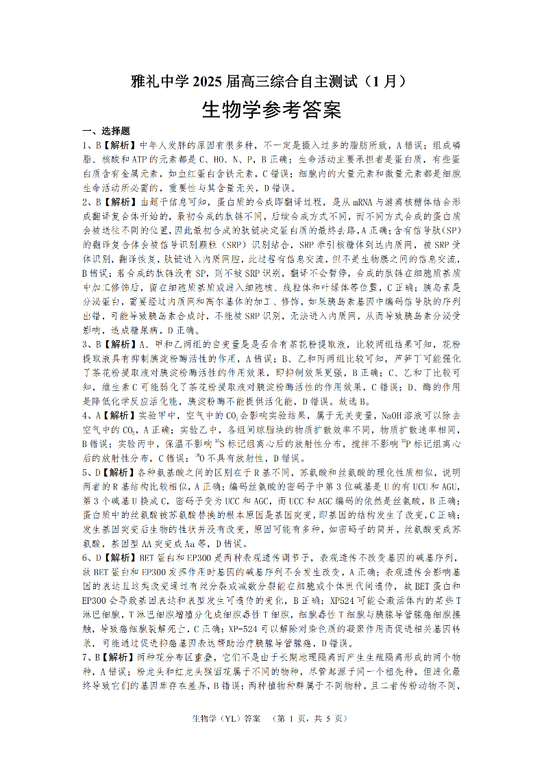 湖南省长沙市雅礼中学2025届高三1月综合自主测试(期末)生物答案.pdf