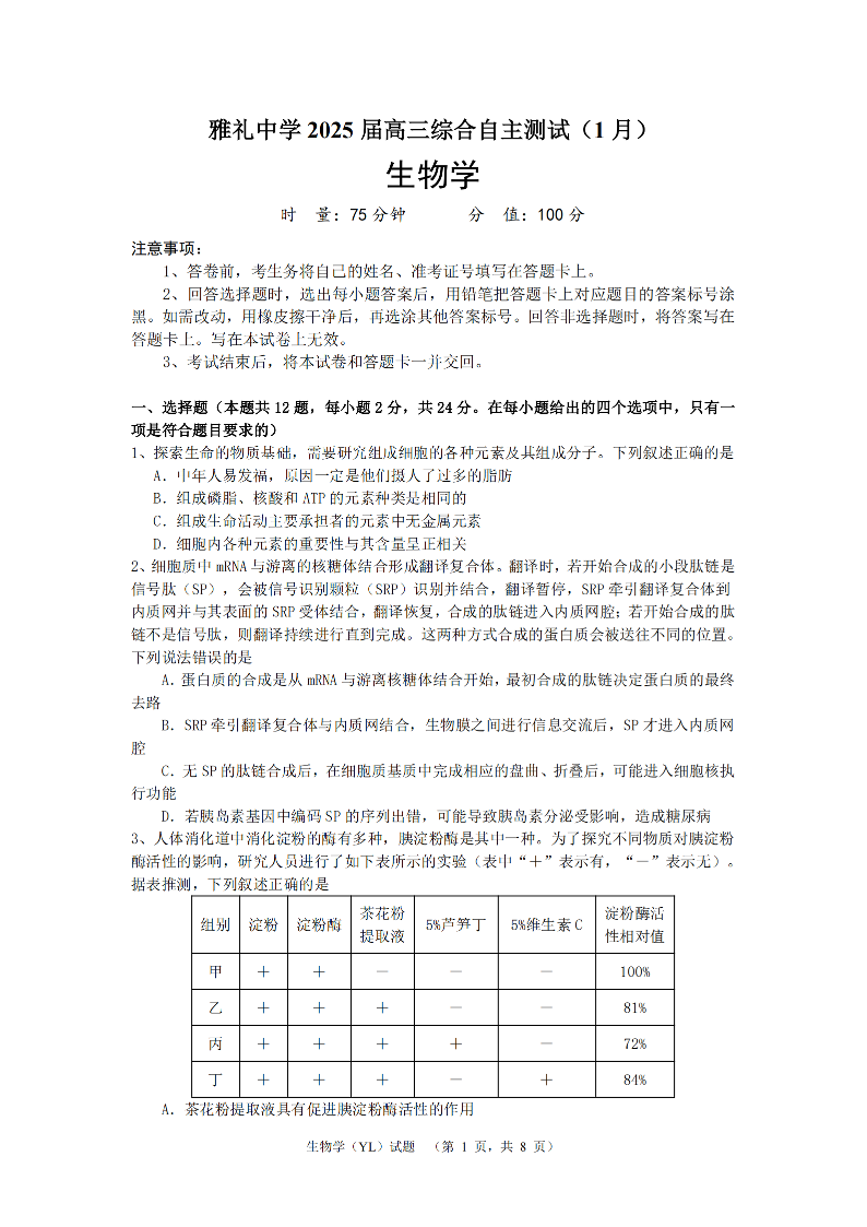 湖南省长沙市雅礼中学2025届高三1月综合自主测试(期末)生物.pdf
