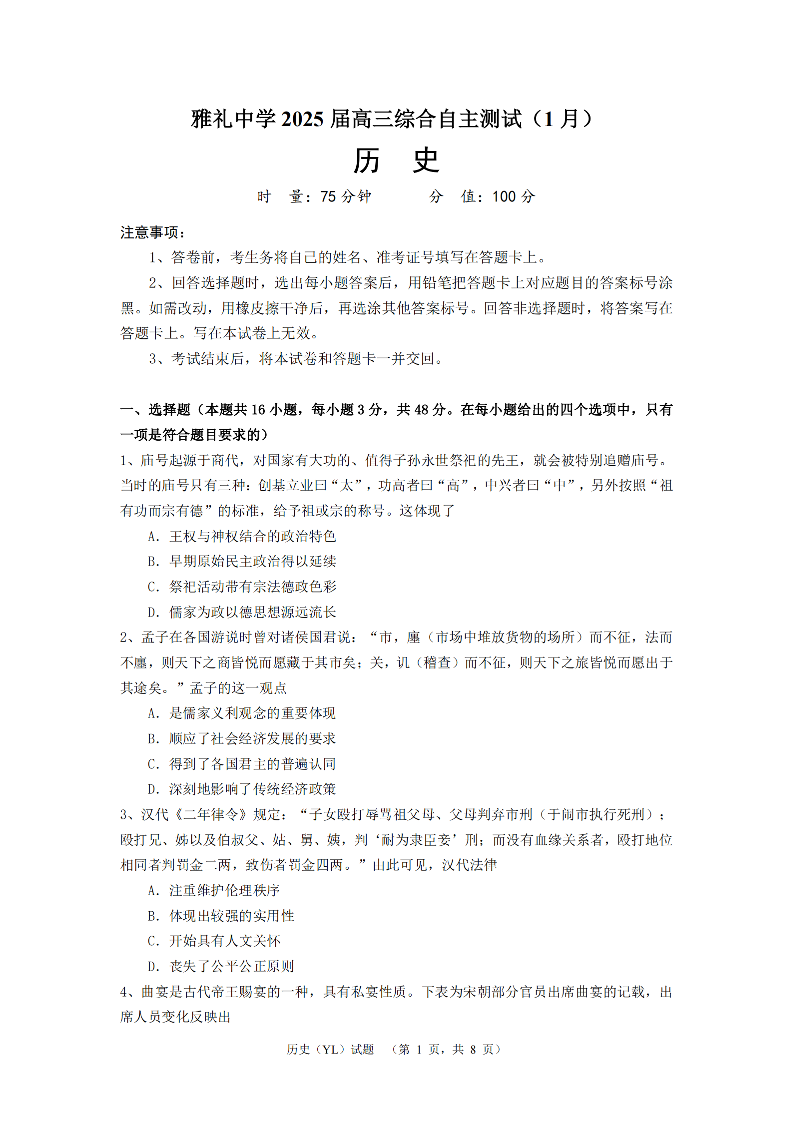 湖南省长沙市雅礼中学2025届高三1月综合自主测试(期末)历史.pdf