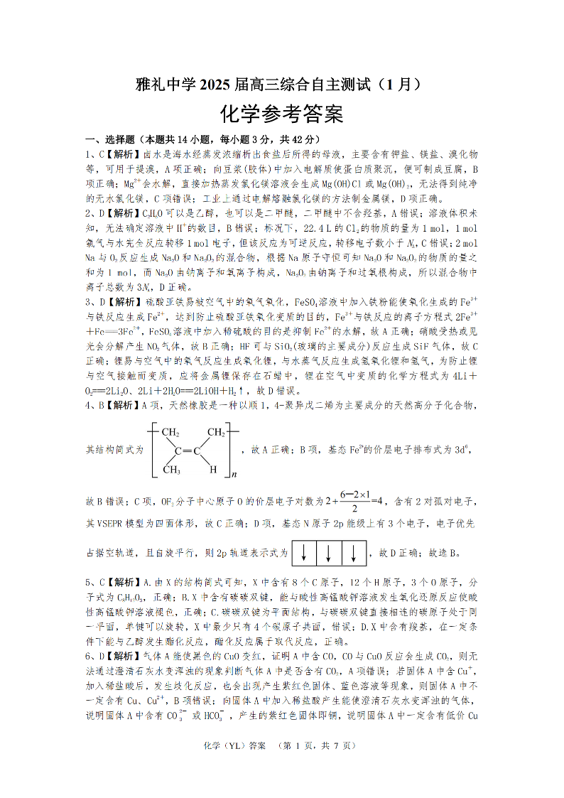 湖南省长沙市雅礼中学2025届高三1月综合自主测试(期末)化学答案.pdf
