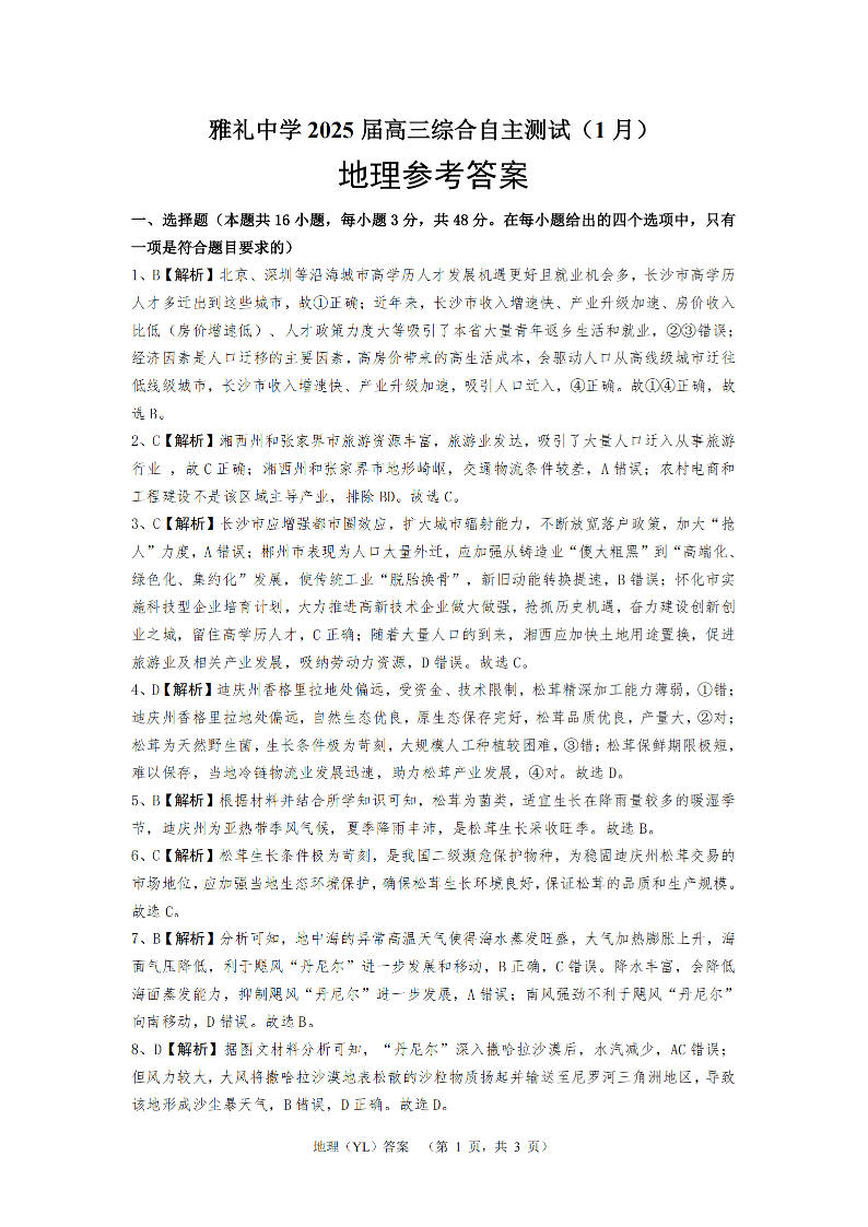 湖南省长沙市雅礼中学2025届高三1月综合自主测试(期末)地理答案.pdf