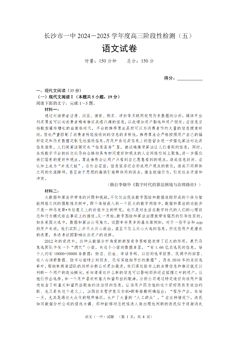 湖南省长沙市第一中学2025届高三上学期阶段性检测(五)语文.pdf