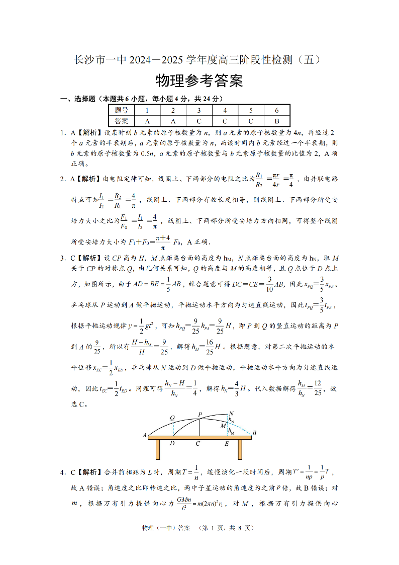 湖南省长沙市第一中学2025届高三上学期阶段性检测(五)物理答案.pdf
