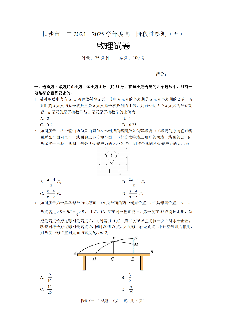 湖南省长沙市第一中学2025届高三上学期阶段性检测(五)物理.pdf