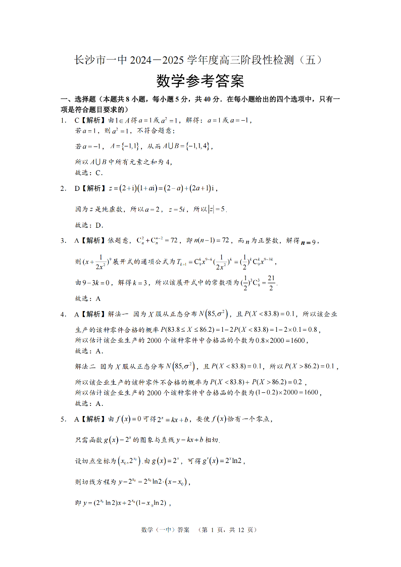 湖南省长沙市第一中学2025届高三上学期阶段性检测(五)数学答案.pdf
