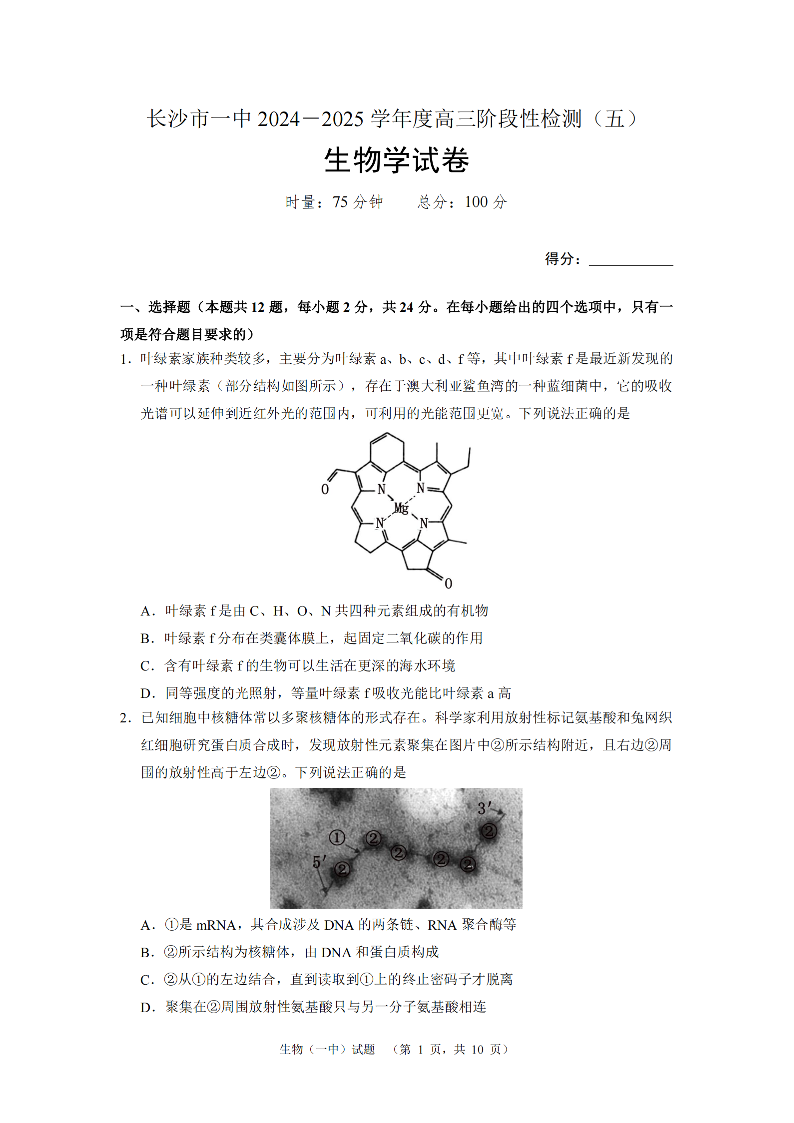 湖南省长沙市第一中学2025届高三上学期阶段性检测(五)生物.pdf