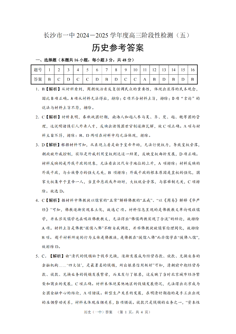 湖南省长沙市第一中学2025届高三上学期阶段性检测(五)历史答案.pdf