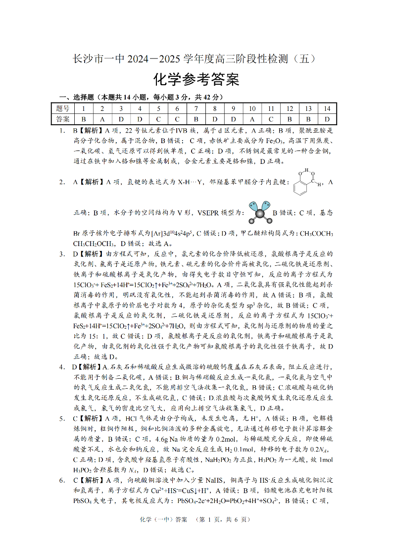 湖南省长沙市第一中学2025届高三上学期阶段性检测(五)化学答案.pdf
