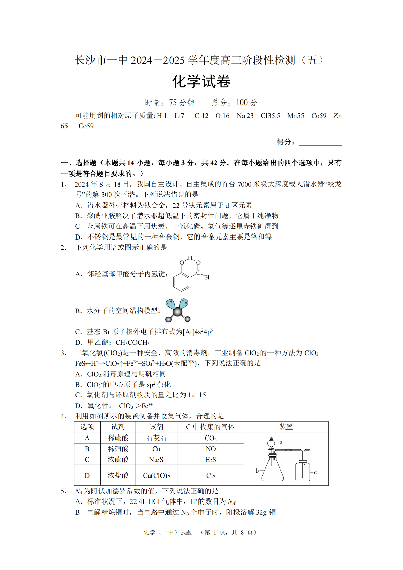湖南省长沙市第一中学2025届高三上学期阶段性检测(五)化学.pdf