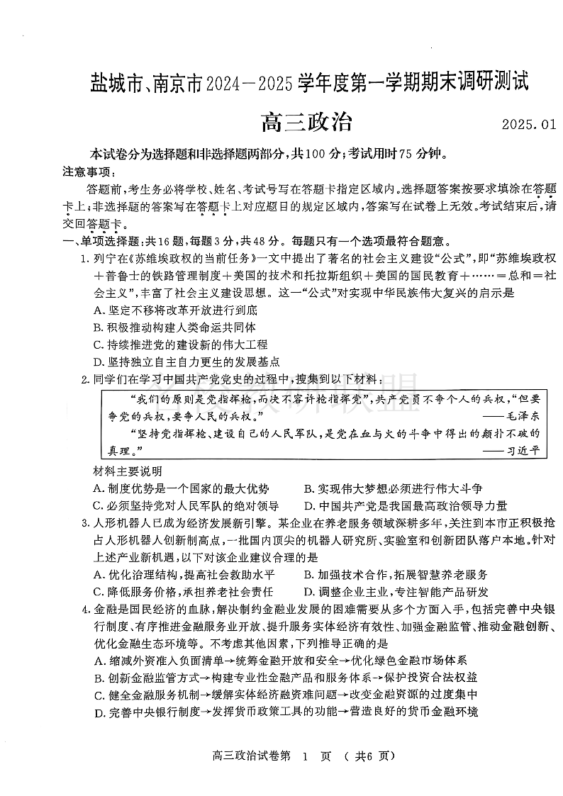 【政治+答案】南京、盐城2024-2025学年高三一模.pdf
