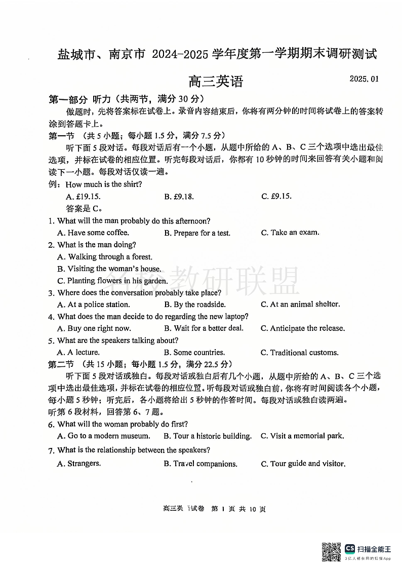 【英语+答案】南京、盐城2024-2025学年高三一模.pdf