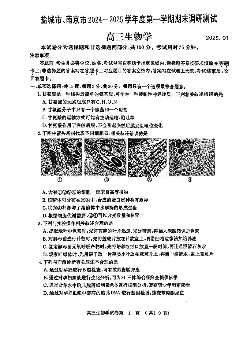【生物+答案】南京、盐城2024-2025学年高三一模.pdf