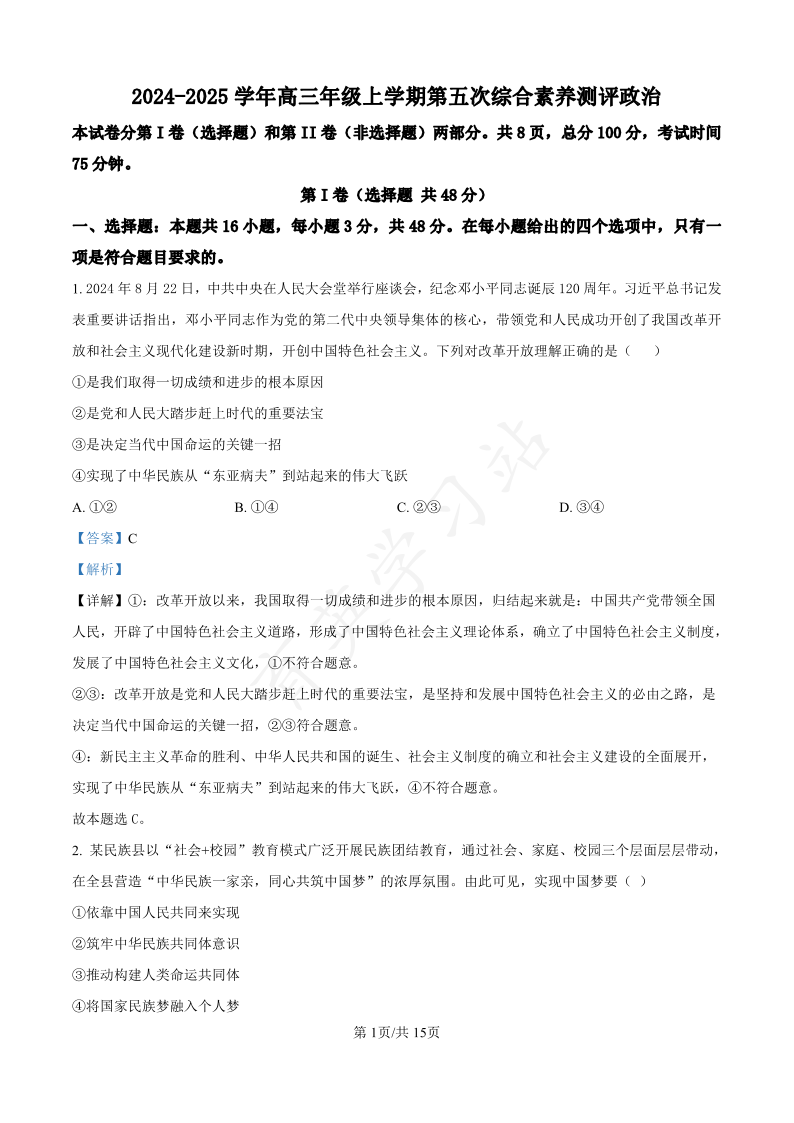 河北省衡水中学2025届高三年级综合素养测评(五)政治答案.pdf