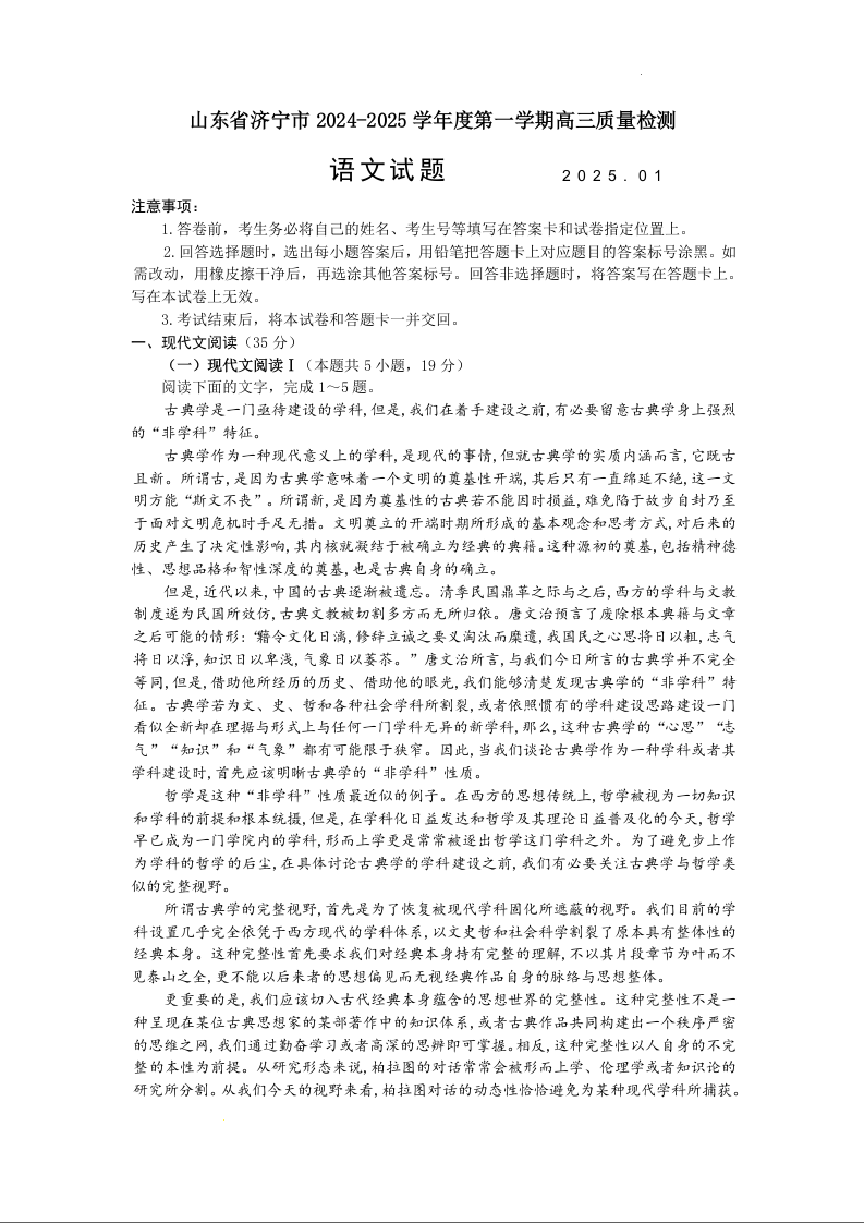 山东省济宁市2025届高三第一学期1月期末质量检测 语文.docx