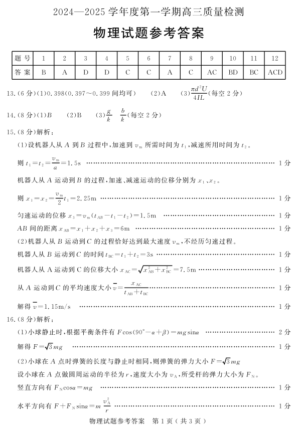 山东省济宁市2025届高三第一学期1月期末质量检测 物理答案.pdf