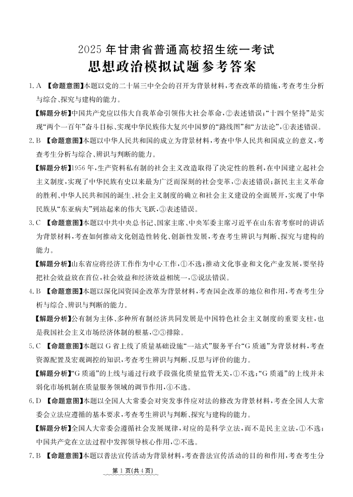 甘肃省白银市部分学校2025届高三上学期1月期末考试 政治答案.pdf