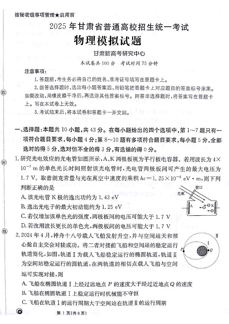 甘肃省白银市部分学校2025届高三上学期1月期末考试 物理.pdf