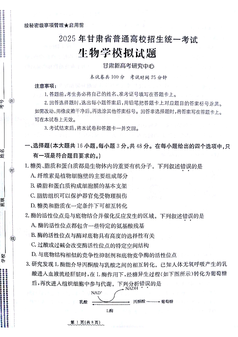 甘肃省白银市部分学校2025届高三上学期1月期末考试 生物.pdf