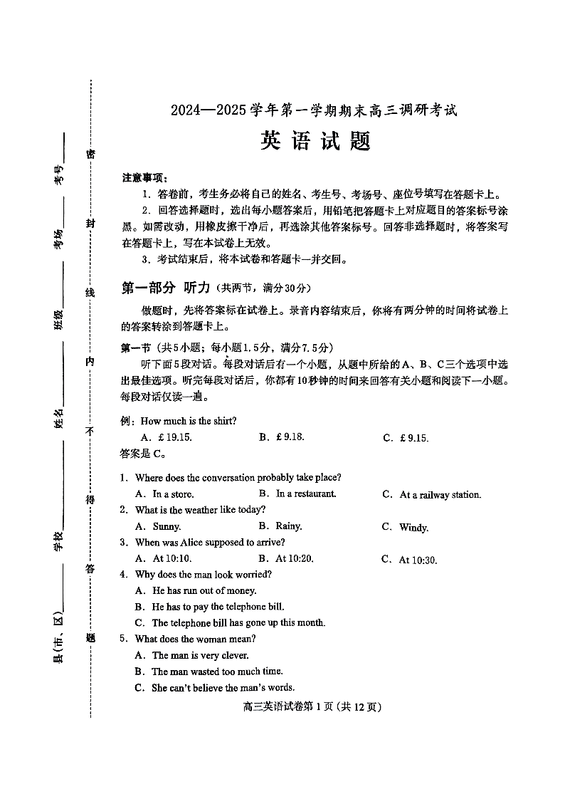 河北省保定市2025届第一学期1月期末高三调研考试 英语.pdf