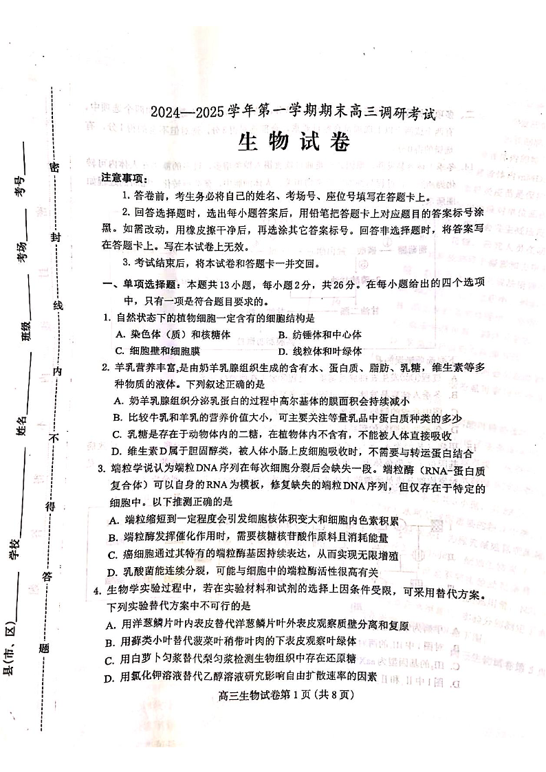 河北省保定市2025届第一学期1月期末高三调研考试 生物.pdf
