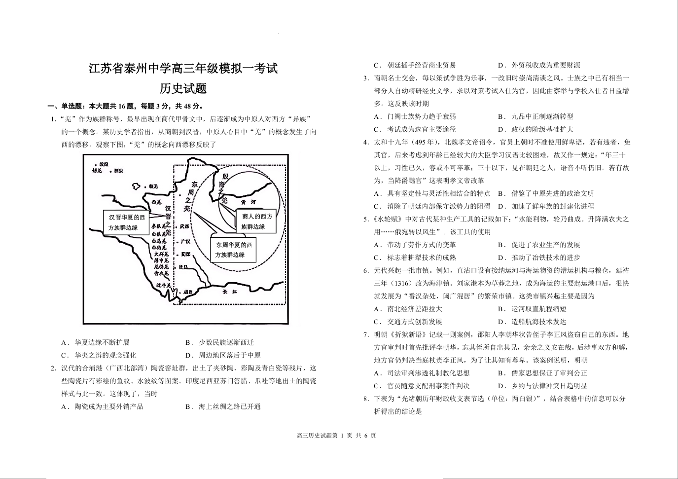 江苏省泰州中学2025届高三上学期一模考试 历史.docx