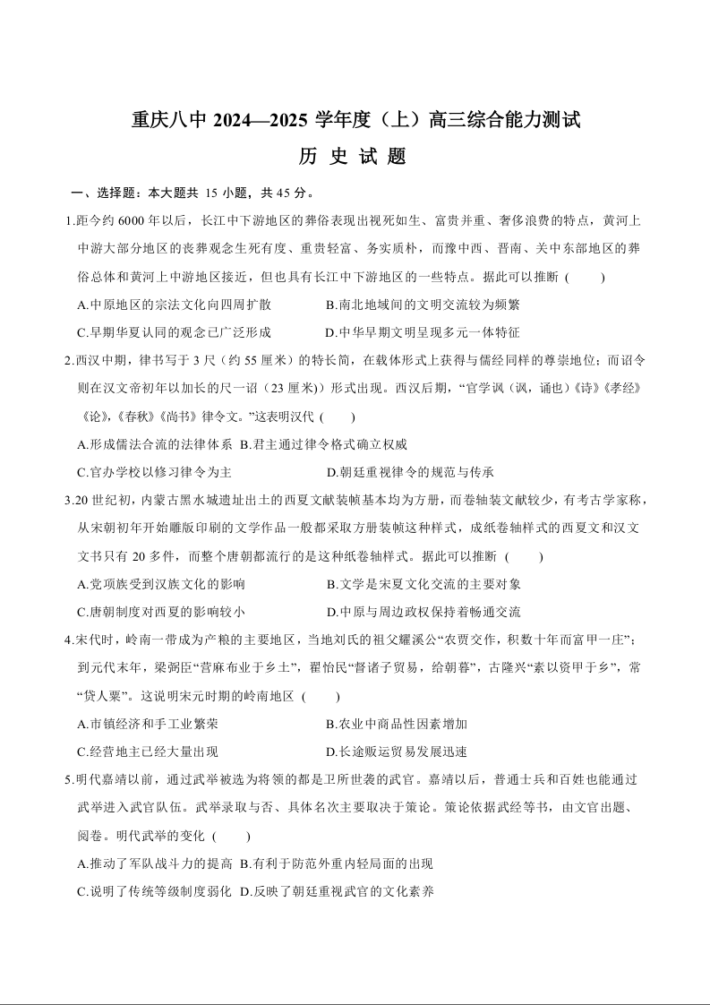 重庆市第八中学2025届高三上学期1月综合能力测试(期末) 历史.docx