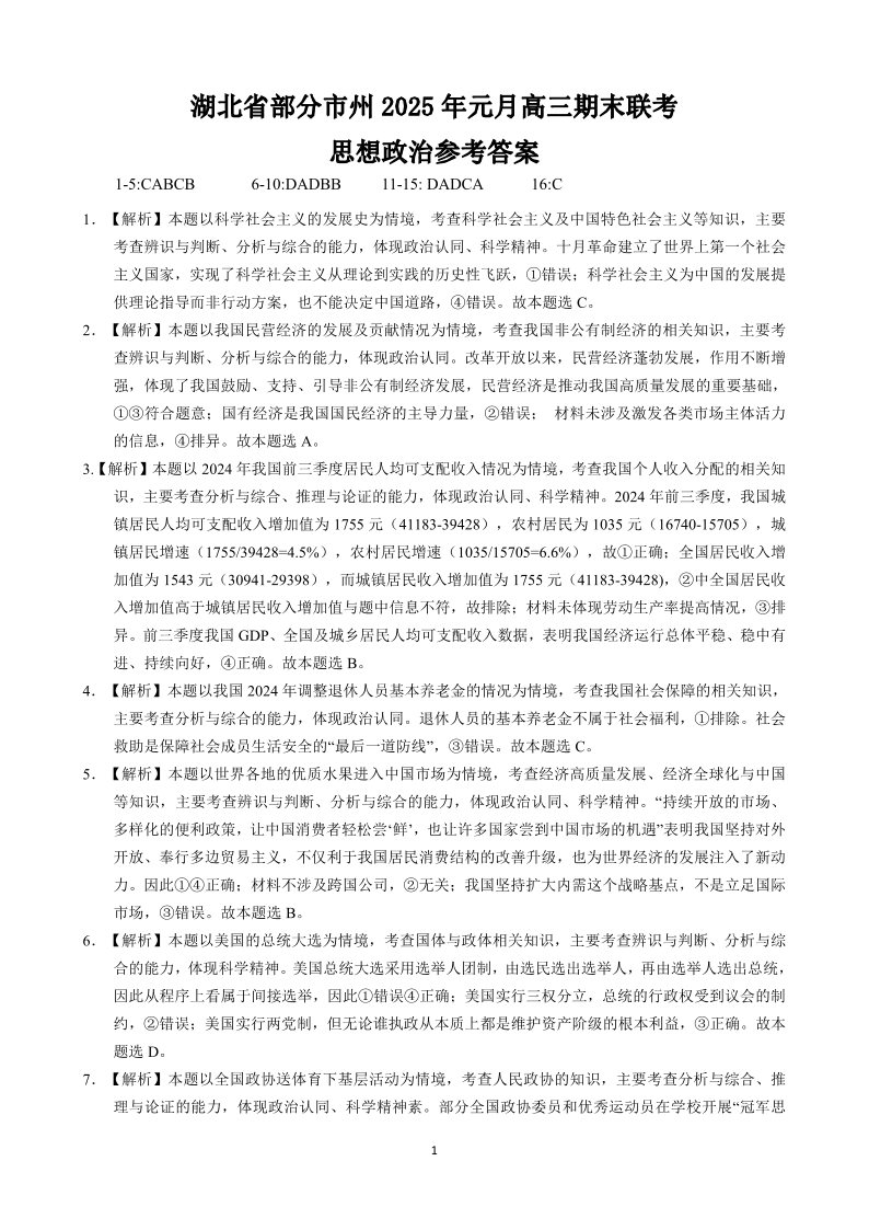 湖北省部分市州元月2025届高三期末联考 政治参考答案.pdf