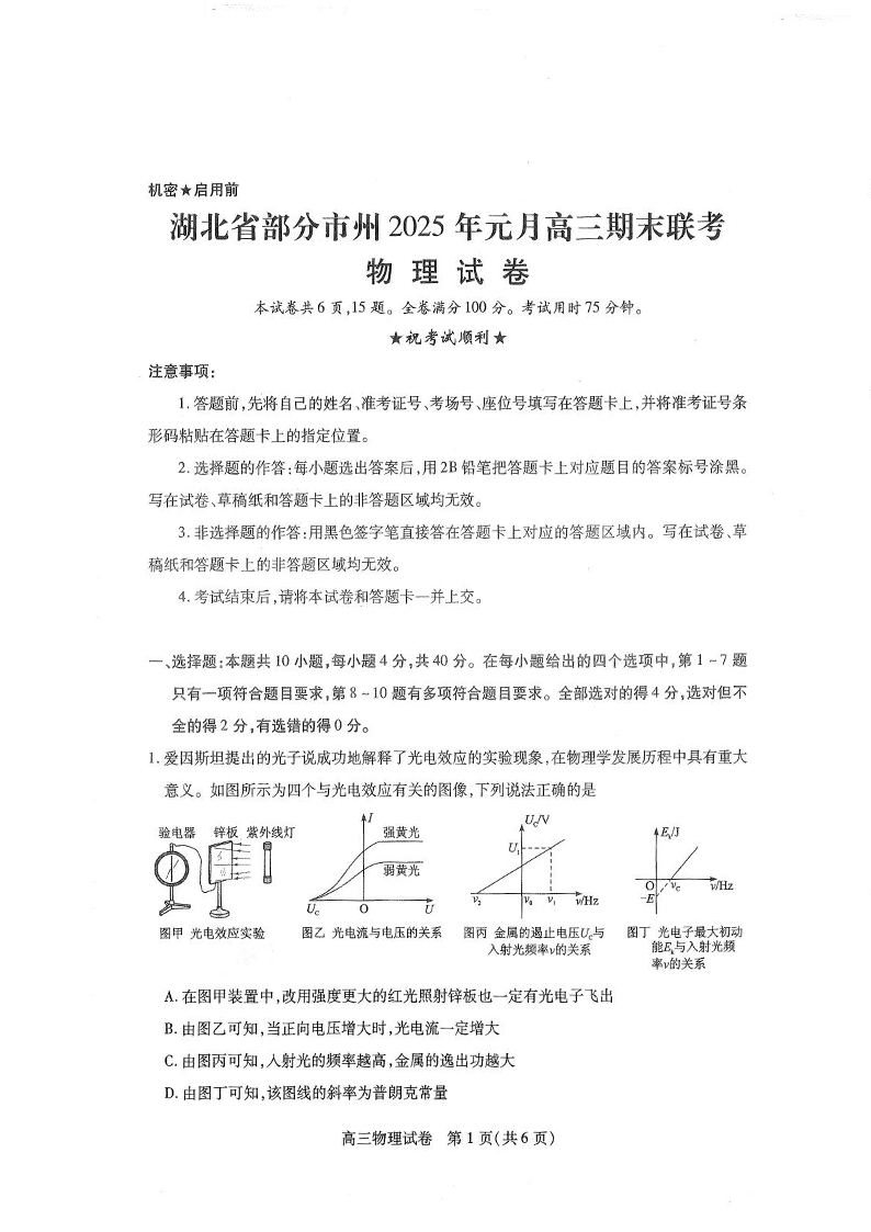 湖北省部分市州元月2025届高三期末联考 物理.pdf
