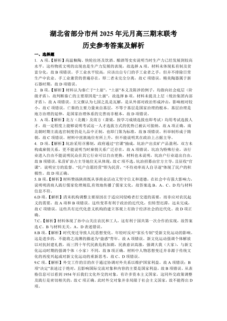 湖北省部分市州元月2025届高三期末联考 历史参考答案.pdf