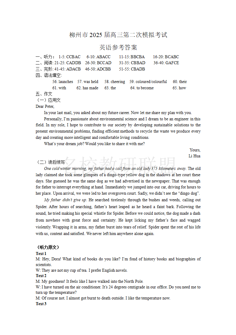 柳州2025年1月高三二模 英语答案.pdf