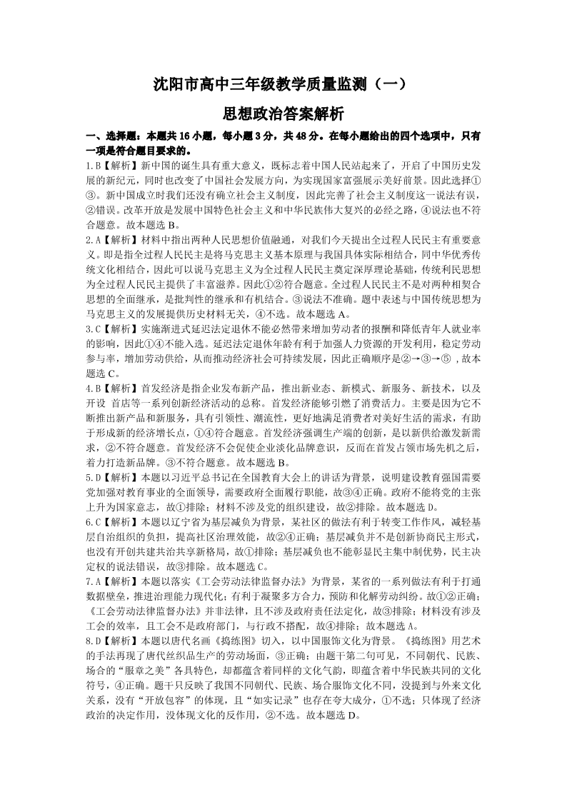 辽宁省沈阳市2025届高三上学期教学质量监测(一)政治答案.pdf