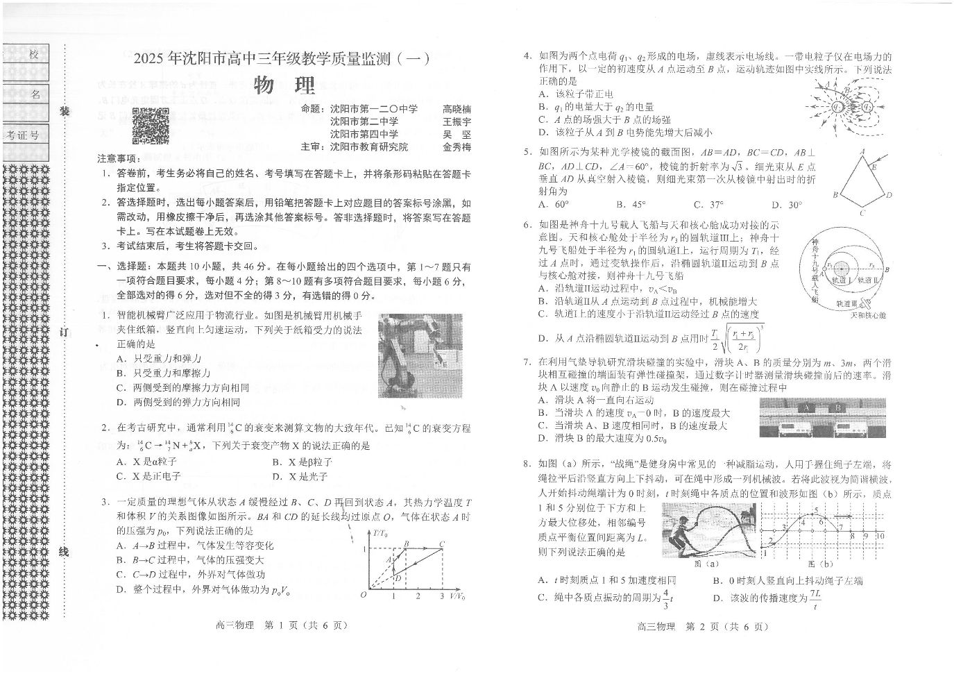 辽宁省沈阳市2025届高三上学期教学质量监测(一)物理.pdf
