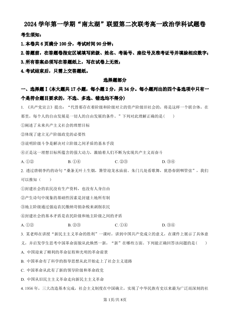 浙江省”南太湖“联盟2024-2025学年高一上学期第二次联考 政治.pdf