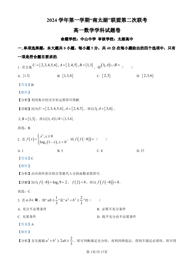 浙江省”南太湖“联盟2024-2025学年高一上学期第二次联考 数学答案.pdf