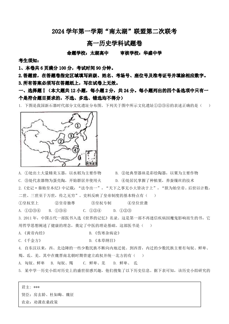 浙江省”南太湖“联盟2024-2025学年高一上学期第二次联考 历史.pdf
