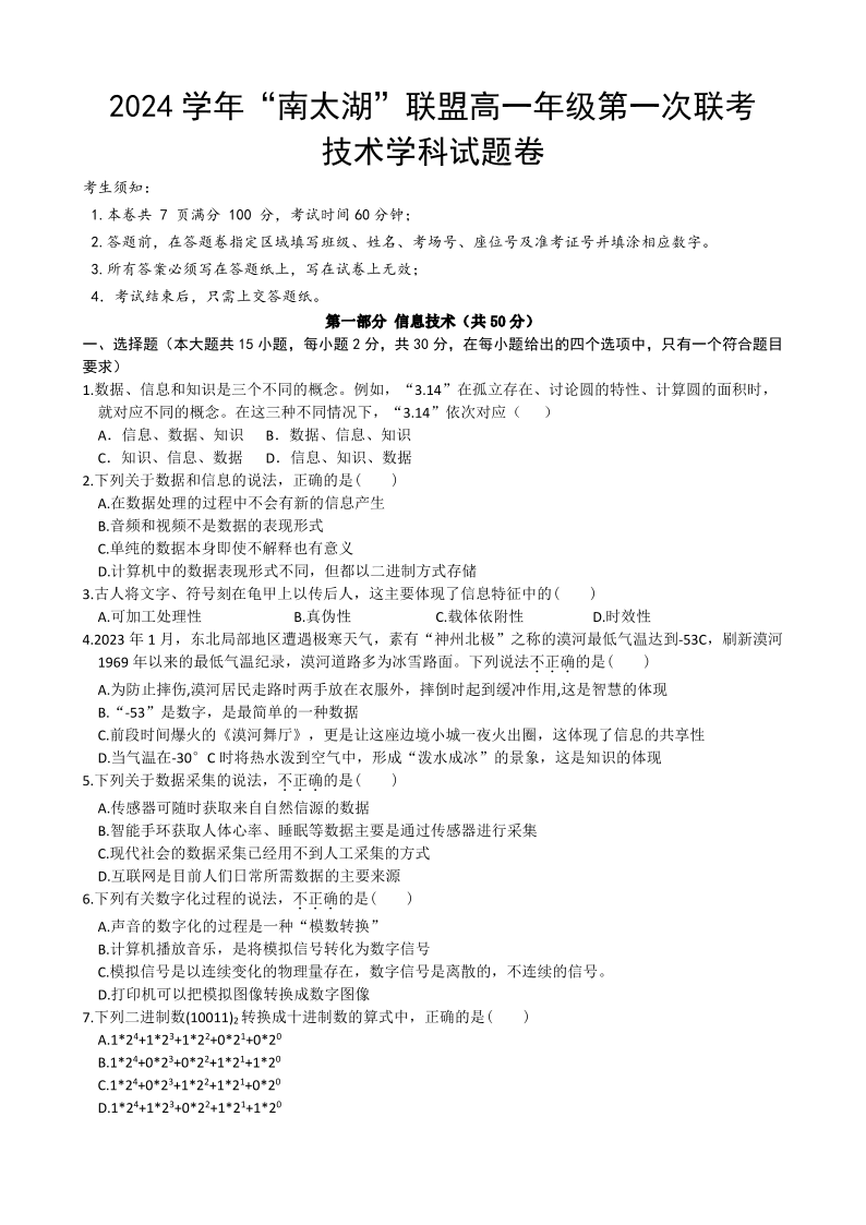 浙江省”南太湖“联盟2024-2025学年高一上学期第二次联考 技术.pdf