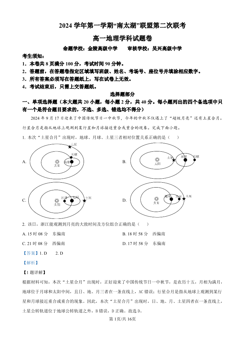 浙江省”南太湖“联盟2024-2025学年高一上学期第二次联考 地理答案.pdf