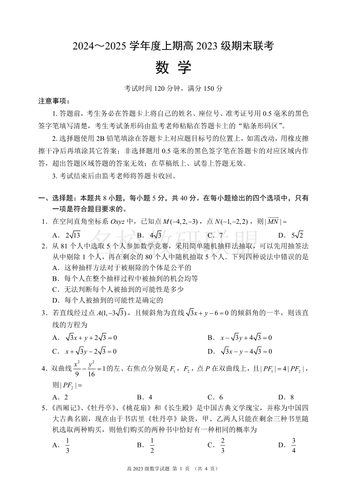 四川省名校联盟2024-2025学年高二上学期期末联考 数学.pdf