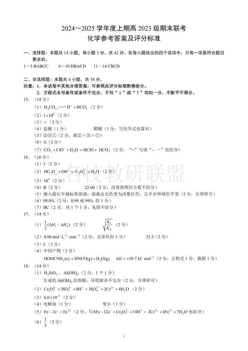四川省名校联盟2024-2025学年高二上学期期末联考 化学答案.pdf